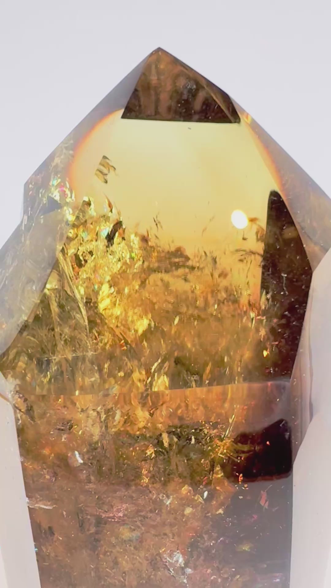 This rainbow smoky citrine point features a tall, well-defined crystal form with soft champagne tones layered with smoky depth. Internal fractures catch the light and produce subtle rainbow flashes throughout the point, adding movement and visual interest. Displayed on a minimalist stand, the piece feels architectural and sculptural, with a strong vertical presence.