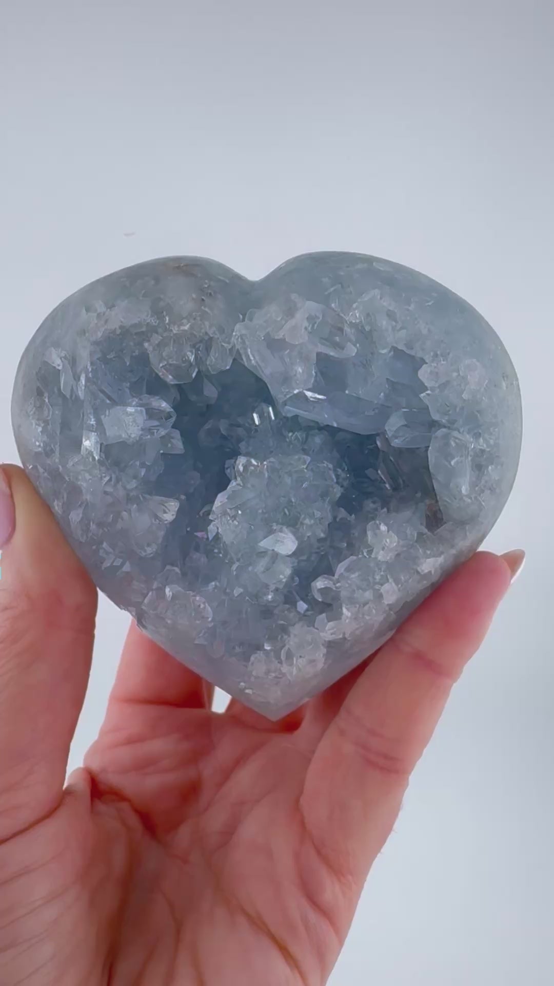 This high quality blue celestite heart features a naturally formed crystal cavity filled with clear to translucent celestite crystals in soft blue-grey tones. The outer surface has been smoothly polished, while the interior is left raw, revealing sharp crystal points and natural depth within the stone. The heart shape frames the crystal pocket beautifully without overpowering the natural formation.